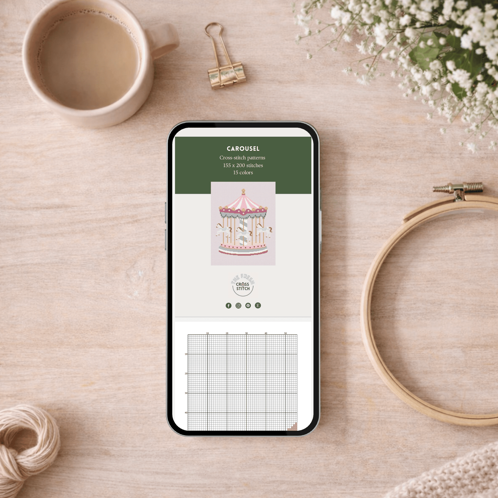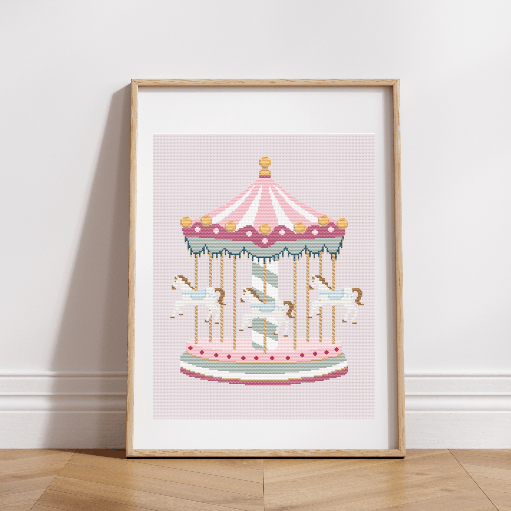 Carousel cross-stitch pattern with horse carousel in pastel colors. Perfect for a baby's room or a handmade gift for a baby shower.