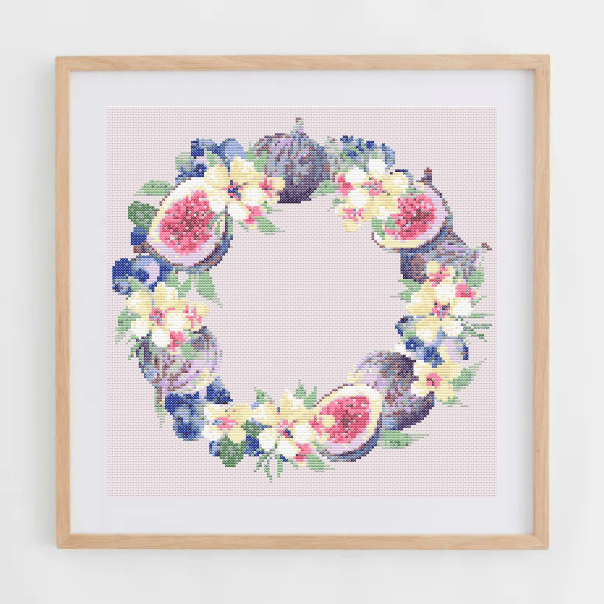 Figs wreath cross-stitch pattern with a wreath made of figs and flowers.